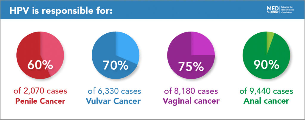 The other four cancers that HPV can cause occur less frequently than cervical and oral cancer, but they can be just as deadly. HPV is responsible for: